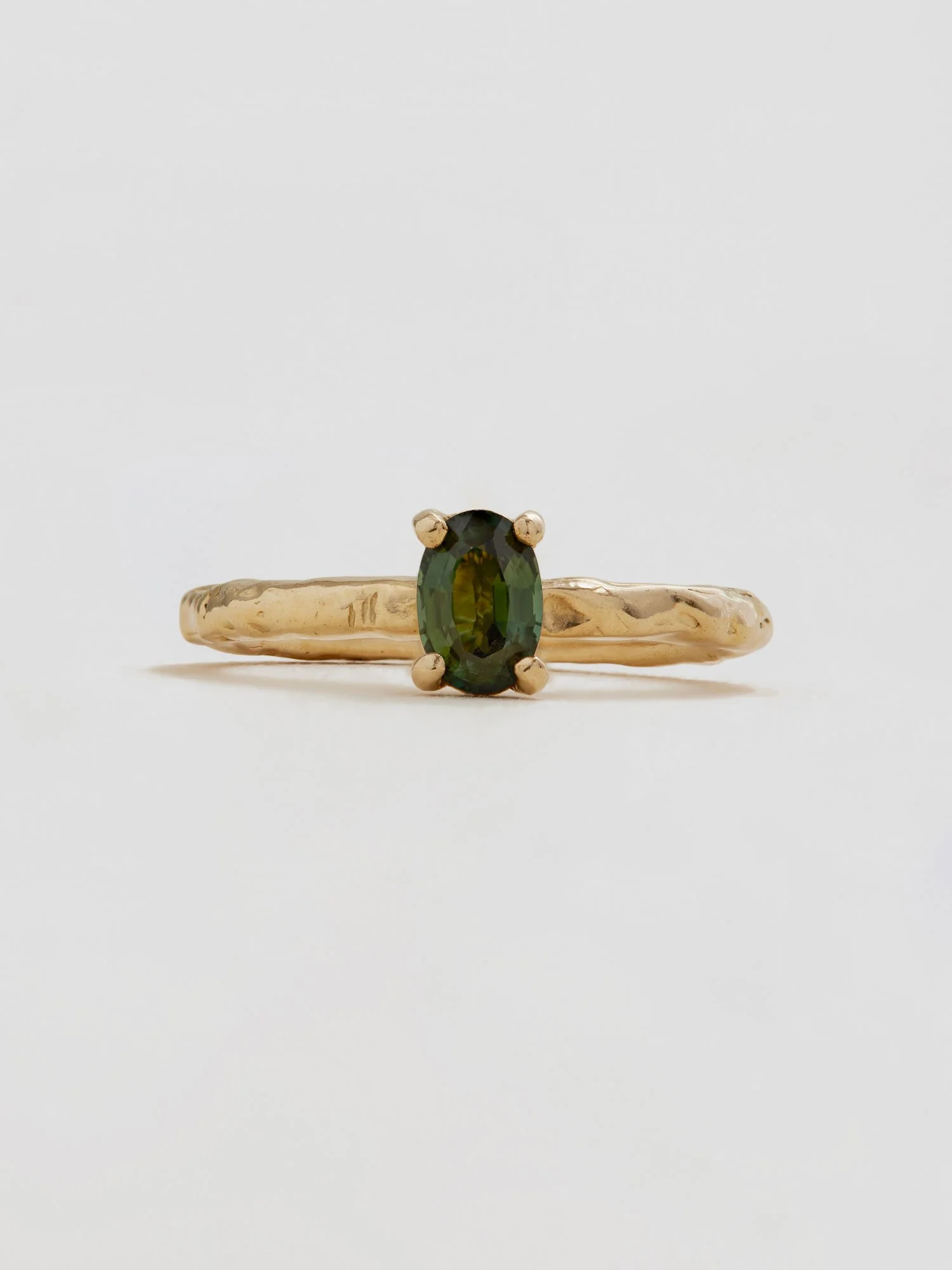 This piece features a 0.5ct Australian green sapphire in a four claw setting. Each piece is hand sculpted and features gently surface textures. The sapphire measures approximately 6mm x 4mm?with the band measuring 2.5mm wide. Please note that each sapphire varies in colour and dimensions are approximate due to it's handmade nature.